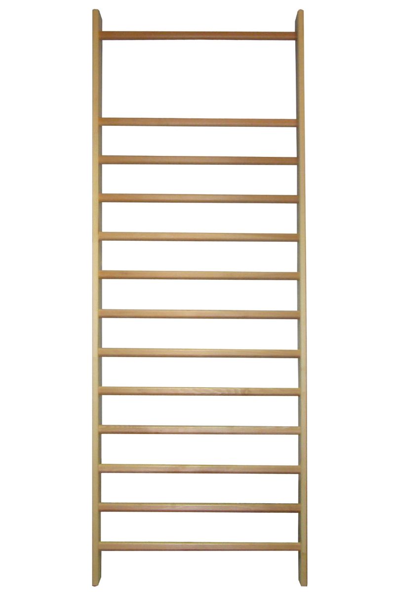 Drewniana drabinka gimnastyczna montowana do ściany, z wieloma poziomymi szczeblami do ćwiczeń.