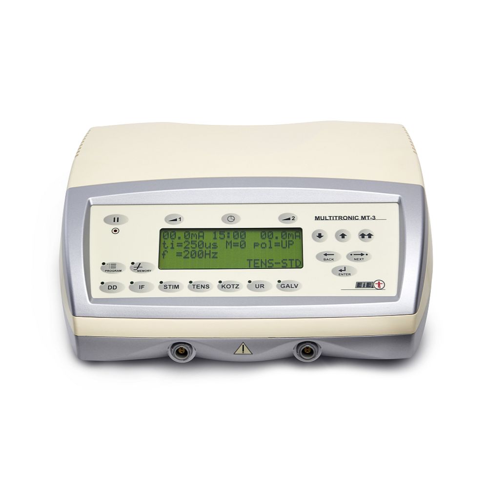 Aparat Multitronic MT-3 do elektrostymulacji z wyświetlaczem LCD i panelem sterowania, widok z przodu.