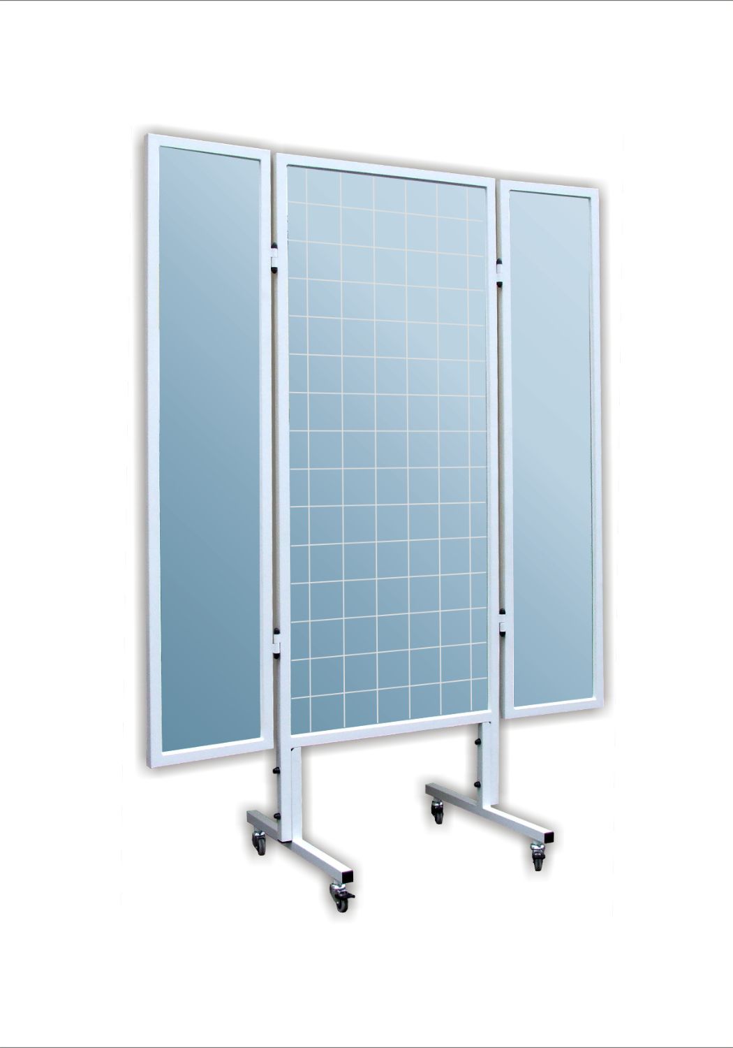 Lustro korekcyjne LT-M z metalową ramą na stabilnej podstawie z kółkami, z siatką do kontroli postawy.