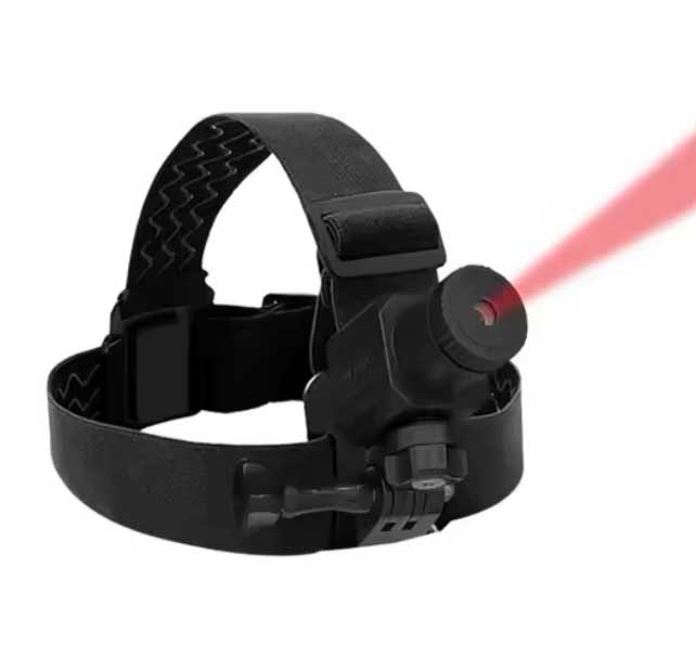 Laserowy trener kręgosłupa szyjnego z opaską na głowę i emisją czerwonej wiązki.