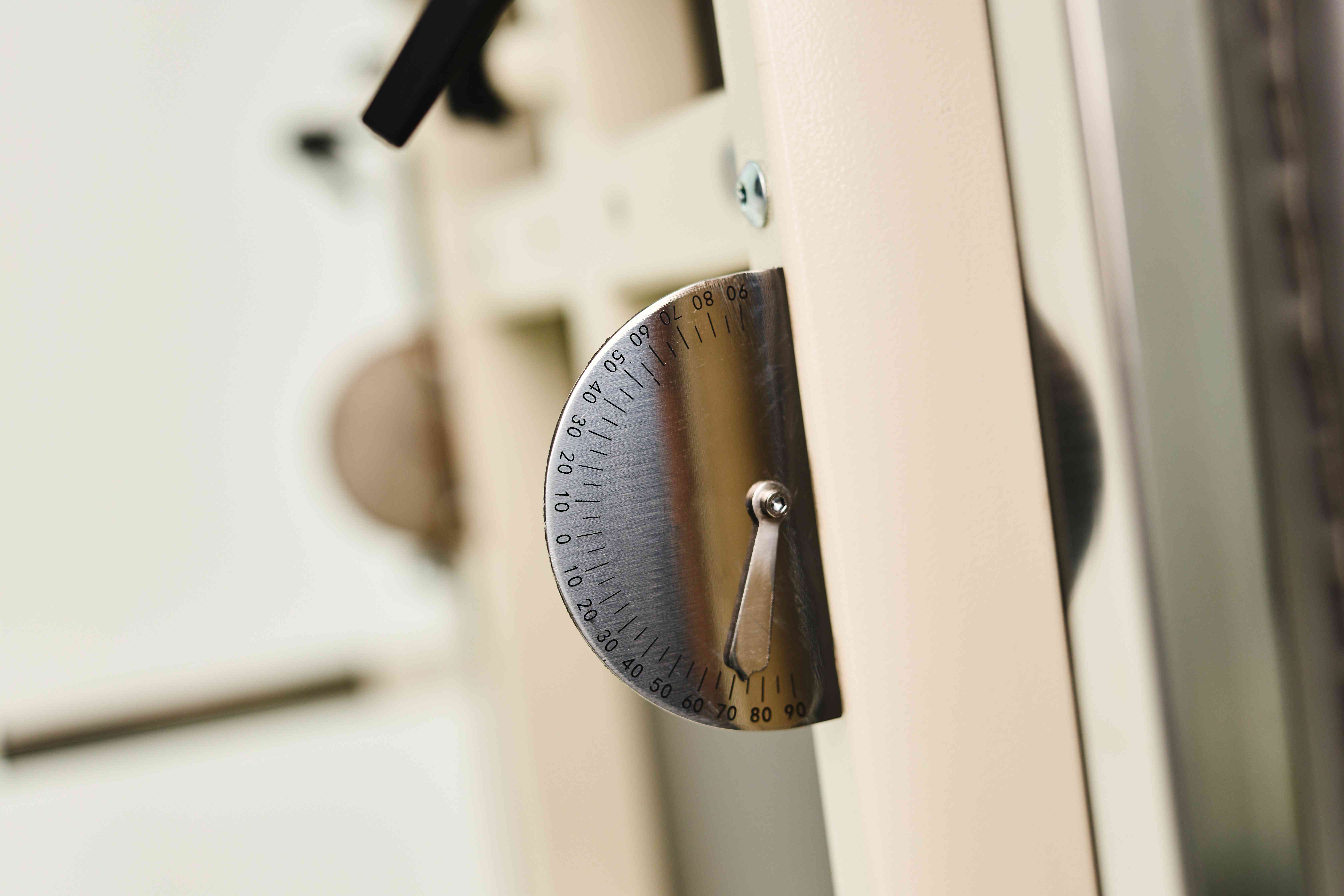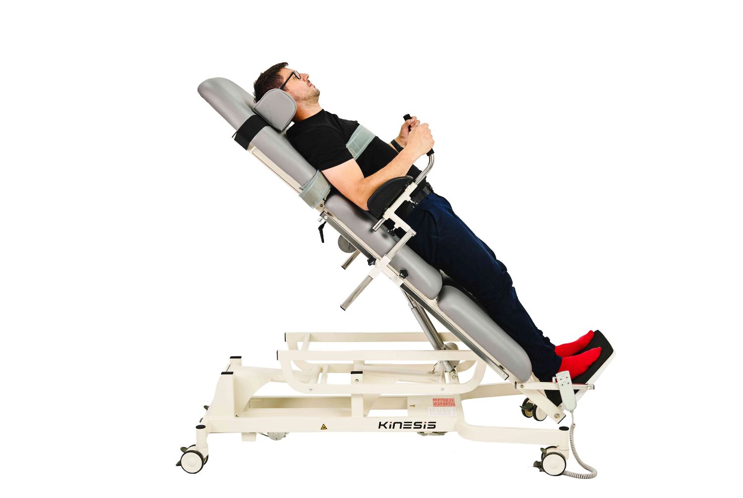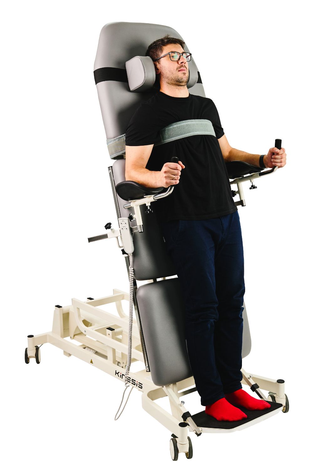 Wysokość oraz kąt pochylenia stołu regulowane za pomocą pilota ręcznego. Stół dodatkowo wyposażony jest w zabezpieczenie, które uniemożliwia zderzenie stołu z podłożem i jego uszkodzenie w trakcie pionizacji oraz posiada kluczyć zabezpieczający przed nieupoważnionym użytkowaniem.