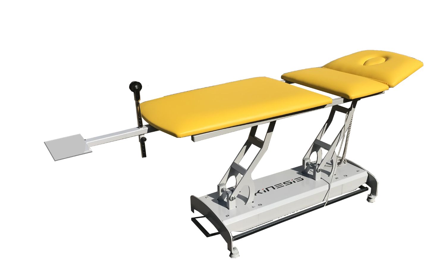 Stół do trakcji kręgosłupa PROFI 3T z żółtym blatem i regulacją segmentów.