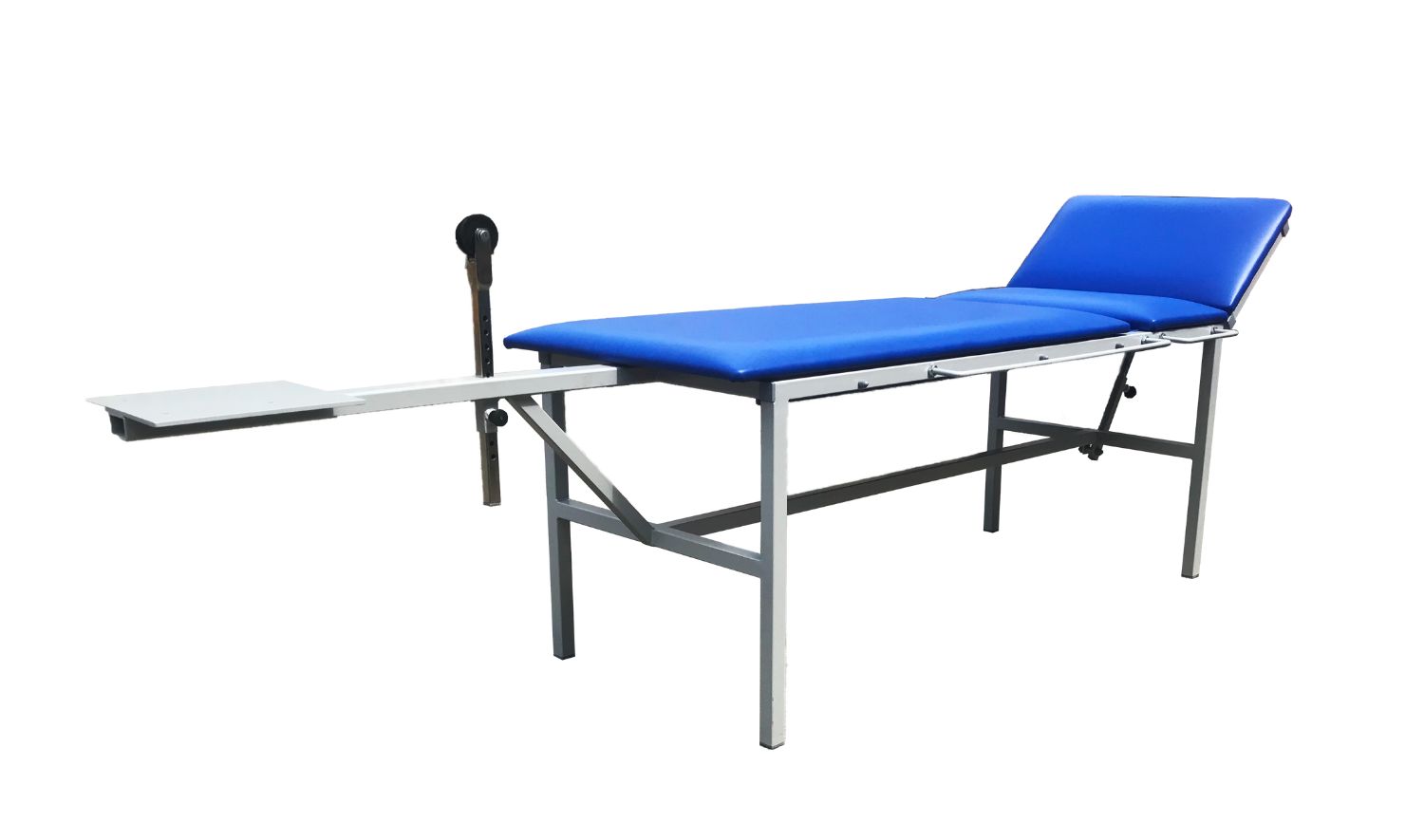 Stół do trakcji kręgosłupa SR-T1 z leżyskiem i wysięgnikiem do mocowania systemu trakcyjnego.