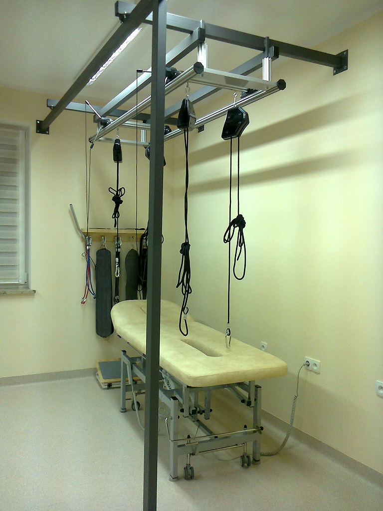 Konstrukcja Kinesis do Sling Therapy, z systemem lin i podwieszeń nad stołem rehabilitacyjnym.