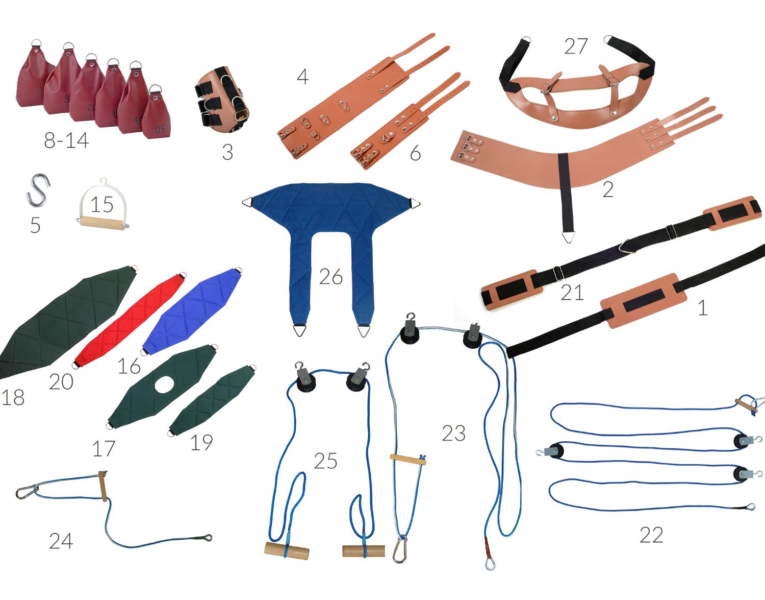 Zestaw osprzętu do UGUL w wersji STANDARD, zawierający podwieszki, pasy, linki i akcesoria do ćwiczeń w kabinie UGUL.